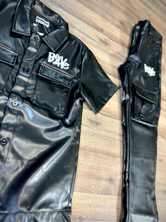 Brave Leather Jacket Shirt And Stacked Flare Pants Set